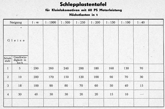 Schlepplastentafel für Kleinlokomotiven mit 75 PS Motorleistung