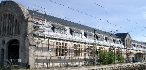 Am 19.4.2005 war der wiedererstandene Kaiserbahnhof in Potsdam erstmalig ohne Bauzäune zu sehen. Im linken Bild ist das Westportal zu sehen. Hinter der verglasten Einfahrt kann man gerade noch einen historischen Waggon erkennen. |