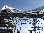 ganz links: Etliche der Träger sind nicht im Lot. Wenn sie später “verbrettert” sind, sieht man es nicht mehr (rechts am 30.10.2004). Ob die früher auch so erbärmlich gebaut haben? oben: das Mittelteil wird montiert, rechts daneben: Detail, die Schrauben werden später durch Niete ersetzt, links: Westansicht, das Dach ist fertig, lediglich der Blitzschutz fehlt noch, |