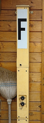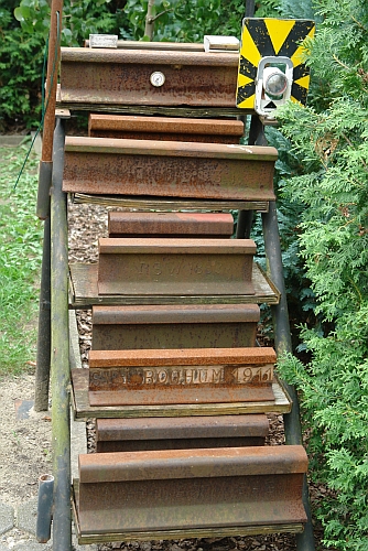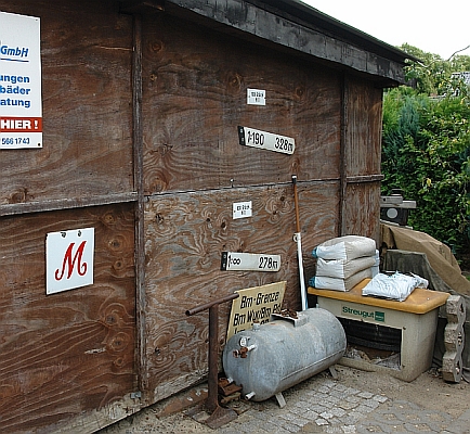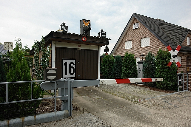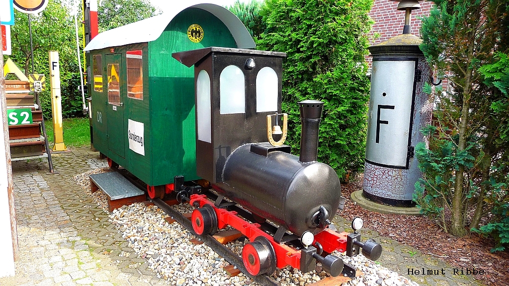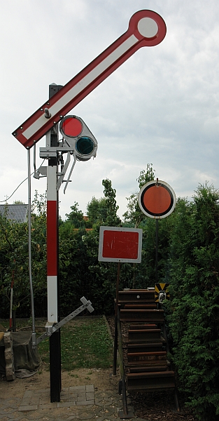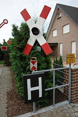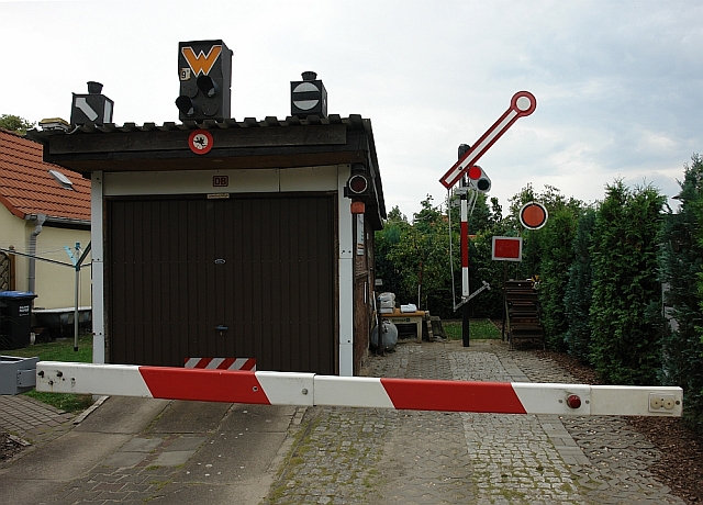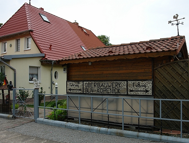 und fuhr von der Autobahn runter auf die B 273, immer durch ein Waldgebiet. Das war wesentlich angenehmer, obgleich es nun nur noch 30 Grad warm war In Börnicke wollte ich eine Rast einlegen und den alten Bahnhof suchen, von dem ich aber nichts mehr fand. Ich war nämlich, wie sich später heraustellte, schon vorbeigefahren. Aber Kienberg würde ich nicht verpassen. Den Weg hatte ich noch gut in Erinnerung. Auf dem schon längst stillgelegten Bahnhof gab es eine uralte doppelte Kreuzungsweiche der Form 6d-190-1:9 St aus dem Jahr 1880 (?), also eine schöne alte Länderweiche auf Stahl. Im obigen Gleisplan von 1965 ist sie schon nicht mehr enthalten. Sie lag aber noch verschlossen im Gleis in Höhe der Laderampe. Die Betonplatten des ehemaligen Bahnüberganges waren noch vorhanden. Das Streckengleis gab es nicht mehr. Da ich im zugewachsenen Gleis nicht laufen konnte, ging ich bahnrechts am Graben entlang. Die dortige Straße heißt ebenso - Am Bahngraben. Keine 20 m vom Bahnübergang entfernt steht ein altes ehemaliges Reichsbahnwohnhaus. Davor sonnte sich im Vorgarten ein Herr und schaut mir interessiert entgegen. Ich sah ihm seine Neugierde an, die sich sogleich auch auf mich übertrug. Als ich freundlich hinübergrüßte, kam die langgezogene Frage: W o l f g a n g ? ? ? Antwort: Ja?! Von 1969 bis 1980 war ich Haupttechnologe in der Bahnmeisterei Wustermark. Die Bm Wur hatte 2 Streckenmeistereien, Wustermark Rbf und Nauen. 1970 kam noch die ehemalige Bm Hennigsdorf durch Zusammenlegung dazu. Der mich so freundlich begrüßte, war ein ehemaliger Kollege aus der früheren Streckenmeisterei Nauen. Nach der "Abwicklung" der Bahnmeistereien ging er für kurze Zeit zum Oberbauwerk Berlin Köpenick und dann zu DB Netz. Von 1980 bis zur Wende war ich auf dem Bahnhof Nauen Dienstvorsteher-Vertreter. Fast 20 Jahre hatten wir uns nicht gesehen. Er ist übrigens noch bei der DB Netz beschäftigt und hat als Eisenbahnfan viele Eisenbahnsachen vor der drohenden Verschrottung gerettet. Sein Grundstück wurde so zum Museum, wie man auf den folgenden Fotos sehen kann. Wer über die B 273 fährt, kommt in der Nähe vom Funkamt Nauen unmittelbar an Kienberg vorbei. Ein Abstecher lohn sich, denn das "Eisenbahnmuseum" ist von der Straße am Bahngraben aus jederzeit gut zu besichtigen, natürlich kostenlos! 14641 Kienberg, Dorfstraße 16 Leider erfuhr ich auch, daß es die schöne alte DKW (doppelte Kreuzungsweiche) nicht mehr gibt. Sie ist in irgend einem Hochofen gelandet.
