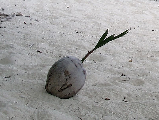 so auch dieser. Hier hänge ich noch ein letztes Mal ab in einer von anderen Urlaubern an schattiger Stelle gleich am Rande des kleinen Urwaldes gefertigten Schaukel aus einem angeschwemmten Fischernetz. Der Hut hing in den Mangroven. Die Brille hatte ein Gast vergessen und liegen gelassen. Na und die Kokosnuß gab es gratis dazu. Mindestens 200 m Strand für mich ganz allein. Das lag aber auch daran, daß dieser Strand nur bei Ebbe gut erreichbar war. Ansonsten durfte man über die Klippen klettern, durch den Urwald oder über eine lange Felsentreppe kraxeln. Bei der Wärme machte das den wenigsten Urlaubern so richtig Spaß und sie blieben lieber am Haus-Strand, an dem auch ihr Bungalow stand. Faulheit laß nach, aber es ist ja Urlaub.